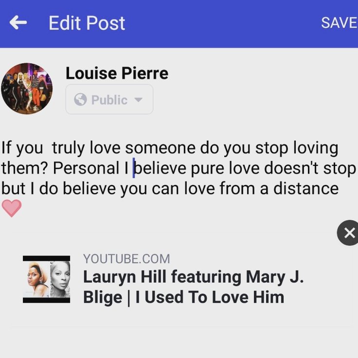 I was listening to “I Used To Love Him” by Lauryn Hill featuring Mary J Blige this morning as I got the children ready for school. It got me thinking that if you really love someone does that love stop? For me I would say no. If you love someone it doesn’t mean that they have to be in your life. Does your love stop when someone dies? NO it doesn’t. Anyway, the thought inspired a Facebook post which I quickly shared and then continued with the morning school run.