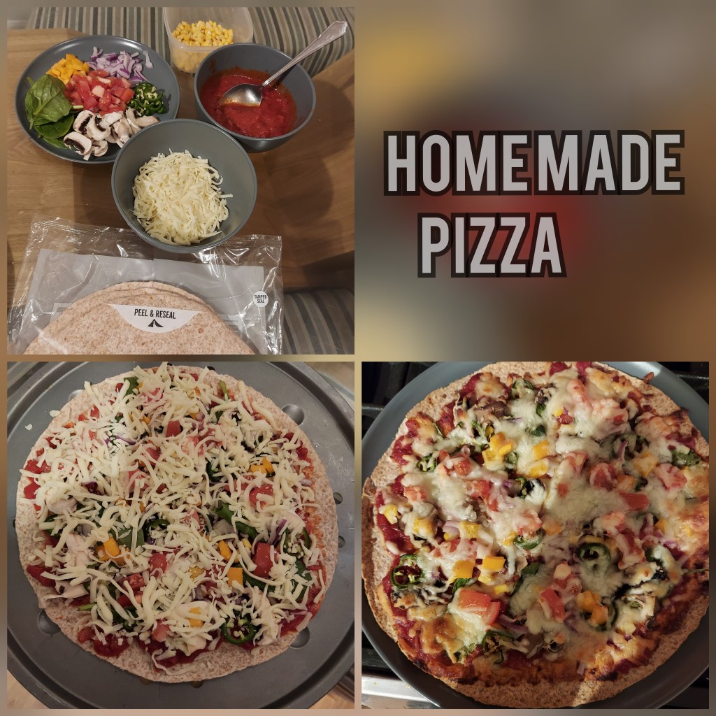 On the days leading up to day 13 I was contemplating what was going to be my first meal. I wanted to celebrate my achievement with the children but didn’t want to eat out or any thing too heavy. We decided on pizza night! Home made pizza and mine was with a wholemeal tortilla base and vegetable toppings.